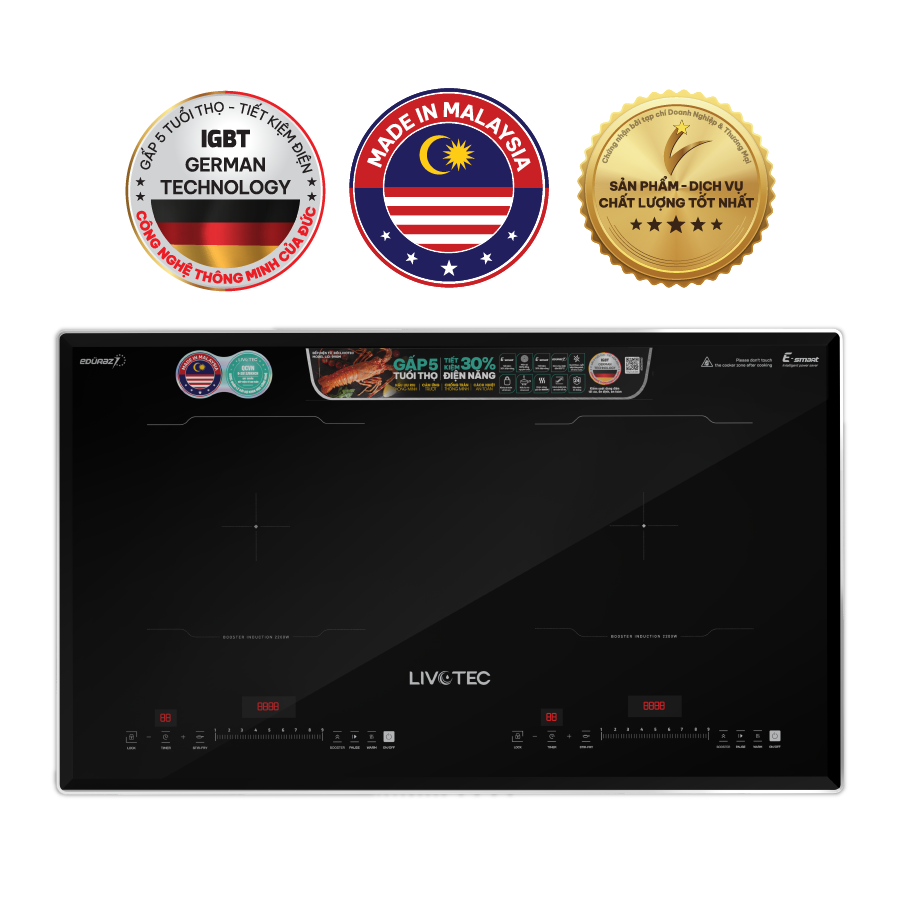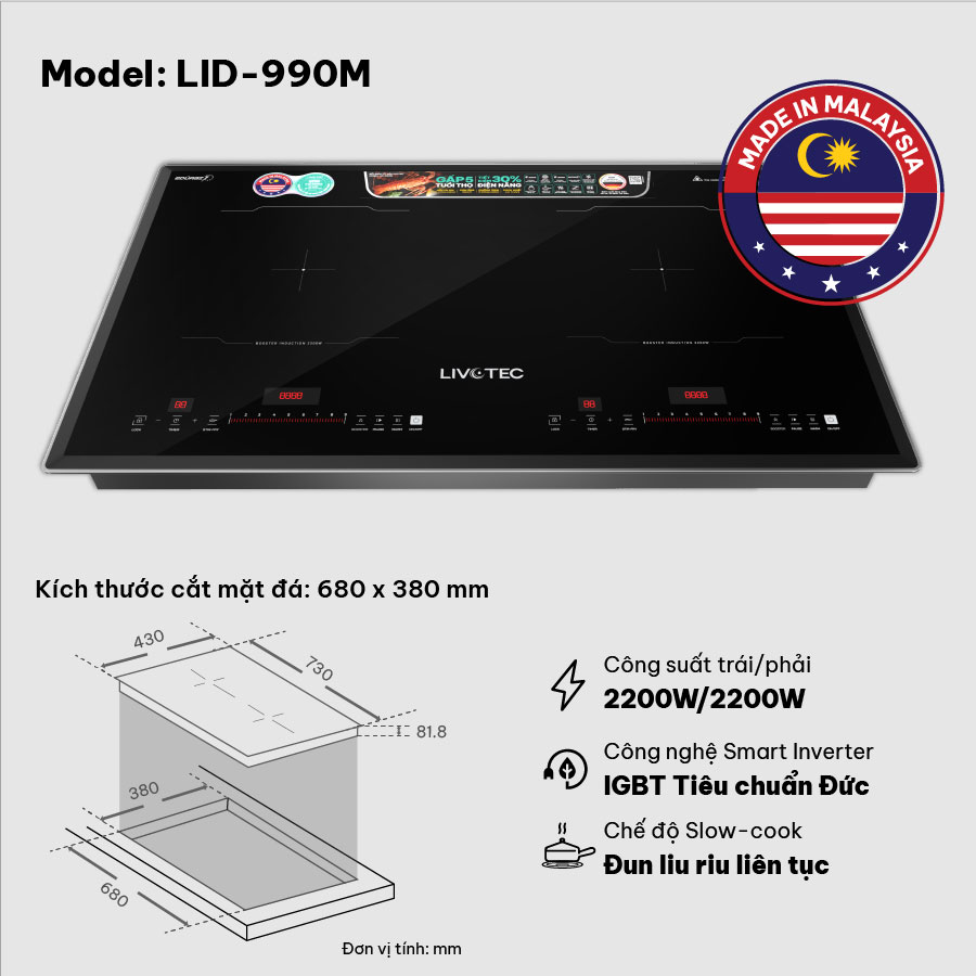 Bếp từ đôi Livotec LID-990M mang đến trải nghiệm nấu ăn tiện lợi với chế độ nấu liu riu ổn định, chống tràn thông minh và cách nhiệt an toàn tuyệt đối. Khi cần tốc độ, Booster siêu tốc giúp làm nóng nhanh chỉ trong vài phút. Sản phẩm được nhập khẩu tại Malaysia, đảm bảo chất lượng bền bỉ cho căn bếp hiện đại.